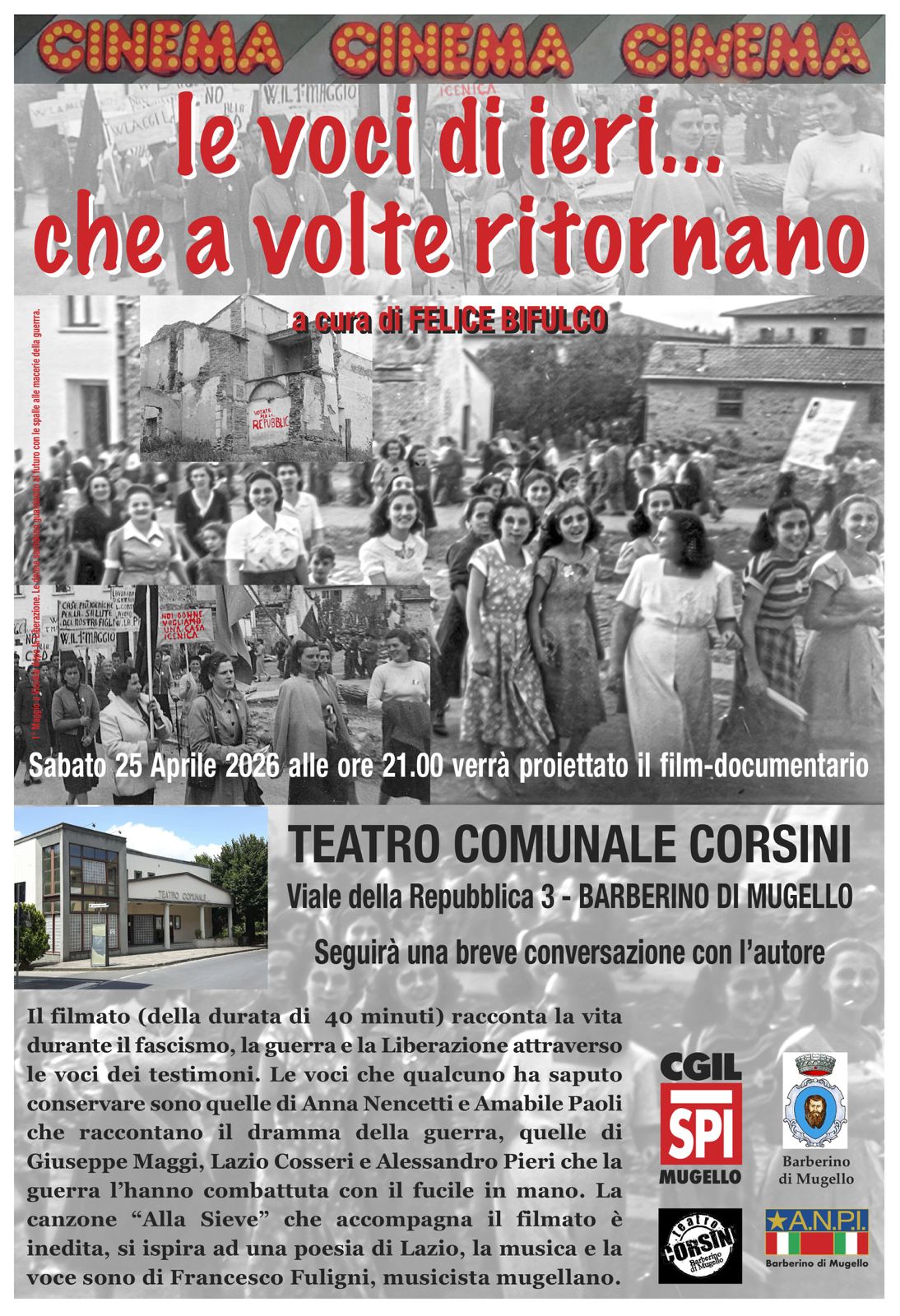 Il filmato racconta la vita durante il fascismo, la guerra e la Liberazione attraverso le voci dei testimoni. Le voci che qualcuno ha saputo conservare sono quelle di Anna Nencetti e Amabile Paoli che raccontano il dramma della guerra, quelle di Giuseppe Maggi, Lazio Cosseri e Alessandro Pieri che la guerra l’hanno combattuta con il fucile in mano. La canzone ”Alla Sieve” che accompagna il filmato è inedita, si ispira ad una poesia di Lazio, la musica e la voce sono di Francesco Fuligni, musicista mugellano.